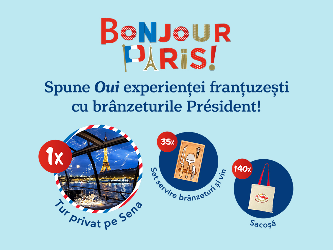 Cumpără brânză Président, înscrie bonul fiscal pe pagina campaniei promoționale și poți câștiga o vacanță romantică la Paris! ???...